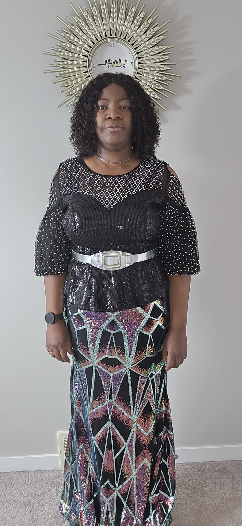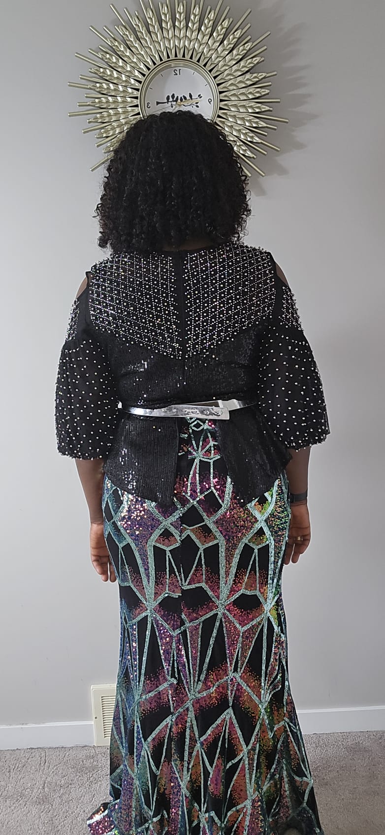 Step into the spotlight with this stunning sequined dress! Featuring a chic black top adorned with shimmering beads and elegant puff sleeves, it exudes glamour. The eye-catching skirt showcases a vibrant geometric pattern in iridescent hues, perfect for any festive occasion. A stylish silver belt cinches the waist, adding a flattering silhouette. Whether it’s a party or a special event, this dress ensures you shine bright and feel fabulous!