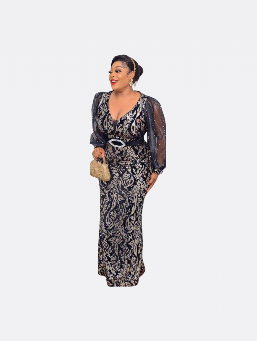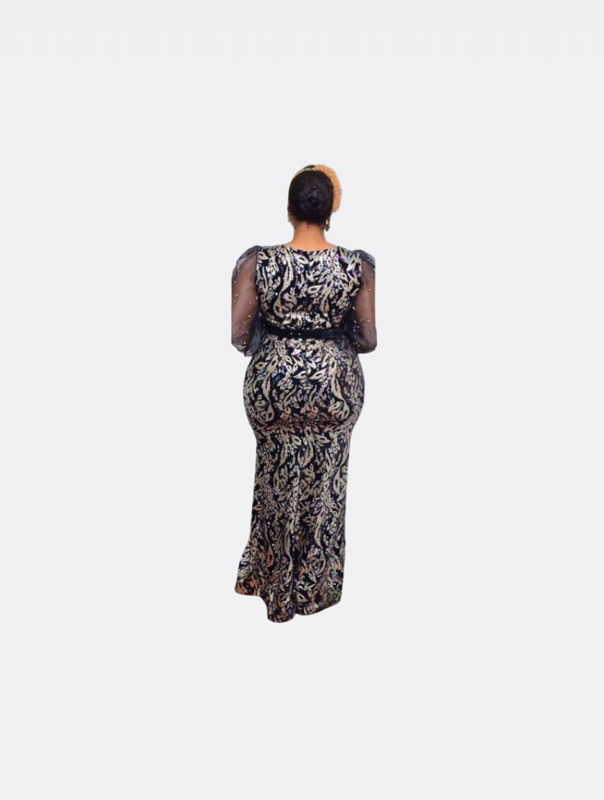This elegant stunning black and gold dress exudes sophistication with its sleek black fabric and intricate gold detailing. The combination of these two colors creates a striking contrast, enhancing the overall allure of the dress. Perfect for formal occasions or special events, this dress is sure to make a statement and leave a lasting impression.